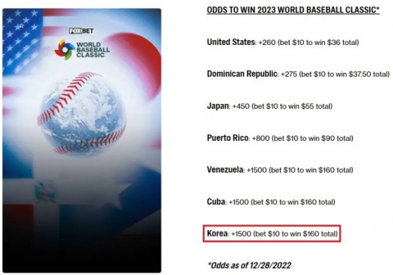 미국 방송사 폭스스포츠 계열의 폭스 베트는 30일(한국시간) 공식 홈페이지를 통해 WBC 우승 배당 전망을 공개했다.
