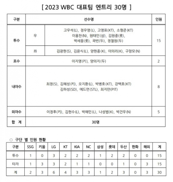 2023 월드베이스볼클래식(WBC)에 출전할 한국 야구 대표팀의 최종 엔트리 30인이 공개됐다.