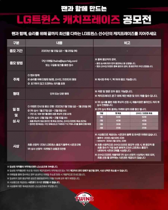 LG 트윈스 캐치프레이즈 공모전은 '팬과 함께', '승리를 위해 단합된 팀의 열정', '포기하지 않고 도전하는 의지' 총 3가지 주제 중 한 가지를 선택해 응모할 수 있다.