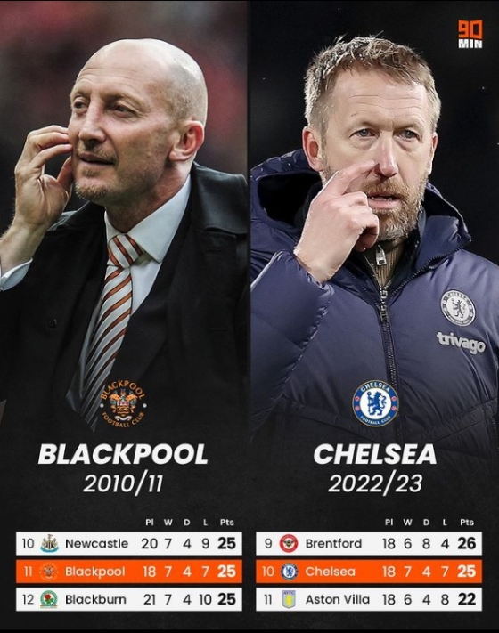 첼시는 블랙풀보다 선수단 수준과 스쿼드 깊이에서 비교는 불가능하다. 그러나 EPL은 타 리그보다 중하위권 팀들의 반격이 만만치 않다. 첼시도 블랙풀처럼 되지 말라는 법은 없다. 첼시와 강등권 18위 에버턴과 승점 차는 10점이다.