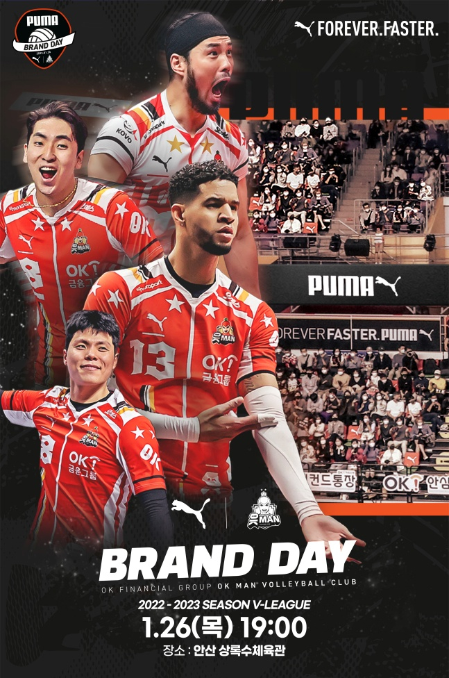 OK금융그룹 배구단은 "26일 안산 상록수체육관에서 열리는 도드람 2022~2023 V리그 남자부 4라운드 현대캐피탈과 홈경기에서 글로벌 스포츠 브랜드 푸마(PUMA) 브랜드데이를 개최한다"고 18일 밝혔다.