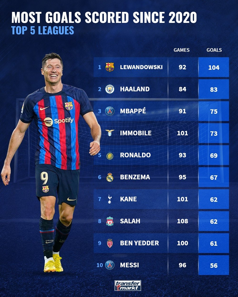 그 뒤를 독일 분데스리가 시절 라이벌 홀란은 84경기 83골을 기록하고 있다. 홀란은 올 시즌 현재까지 21골로 5대리그 포함 엄청난 득점력을 과시 중이다. 그러나 레반도프스키를 넘기에는 역부족이었다.