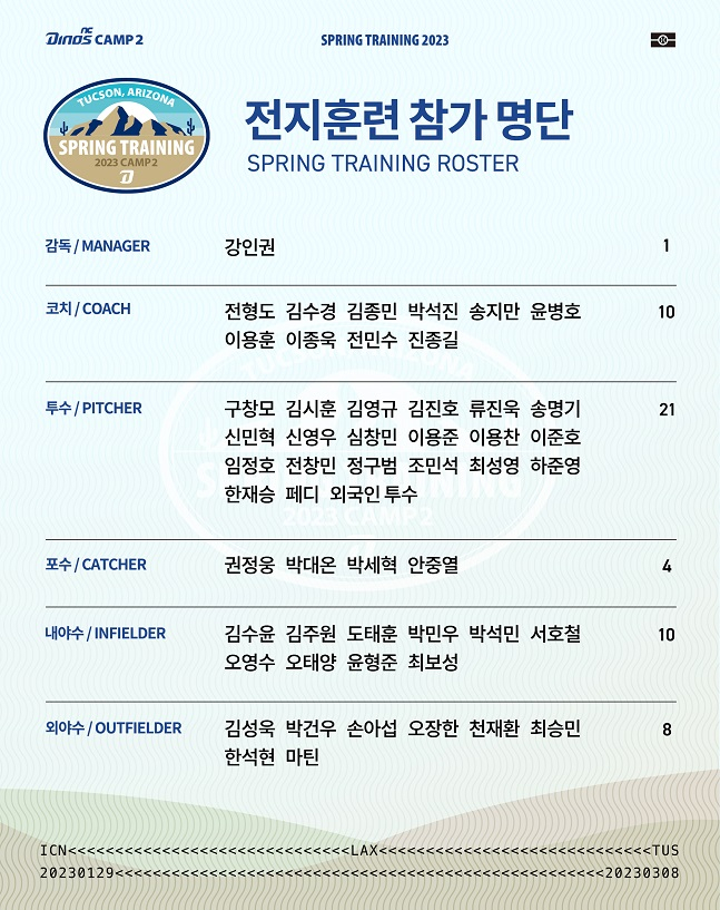 NC는 20일 "CAMP 2(NC 스프링캠프)를 위해 29일 미국 애리조나 투손으로 향하며 2023시즌을 위한 본격적인 담금질을 시작한다"고 전했다.