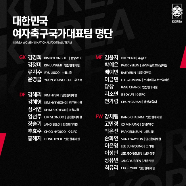 이번 명단에는 지소연을 비롯해 이금민 등 주축 선수들이 포함됐다. 인천현대제철의 김정미와 김혜리, 장슬기 등도 부름을 받았고, 여자축구의 미래로 꼽히는 천가람(울산과학대) 이은영(고려대) 배예빈(포항여전고)도 소집훈련에 참가한다. 다만 조소현(토트넘 위민)과 이민아(현대제철), 이영주(마드리드CFF) 등은 부상으로 제외됐다.