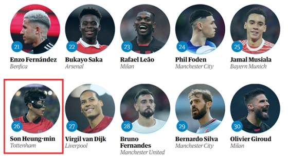 손흥민은 26일(한국시간) 가디언이 발표한 2022년 세계 최고의 남자 축구 선수 톱 100에서 26번째로 이름을 올렸다. 매체는 선수 출신을 비롯해 코치나 방송인, 기자 등을 심사위원으로 꾸려 선수들의 2022년 활약상을 평가한 뒤 순위를 매겼다.