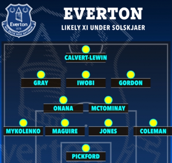 솔샤르 감독이 부임할 경우 에버턴은 도미닉 칼버트-르윈이 최전방에 서고 더마레이 그레이, 알렉스 이워비, 앤서니 고든이 2선에 배치된다. 중앙 미드필드는 아마두 오나나와 맥토미니로 변화를 주고 포백도 비탈리 미콜렌코, 매과이어, 존스, 셰머스 콜먼이 호흡을 맞출 것으로 봤다.