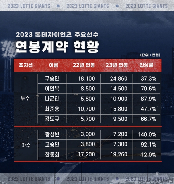 야수진에서는 황성빈과 고승민이 각각 140%, 92.1% 인상율을 기록하며 7300만원과 7200만원에 계약을 체결했다.