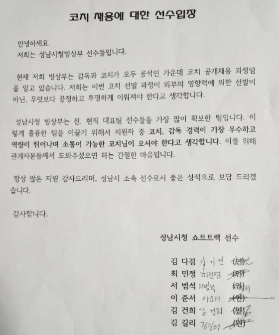 앞서 최민정은 "이번 코치 선발 과정이 외부의 영향력에 의한 선발이 아닌, 무엇보다 공정하고 투명하게 이뤄져야 한다고 생각한다"며 "지원자 중 코치, 감독 경력이 가장 우수하고 역량이 뛰어나며 소통이 가능한 코치님이 오셔야 한다고 생각한다"는 호소글을 SNS에 올렸다. 입장문에는 최민정뿐 아니라 김다겸 서범석 등 다른 5명의 선수들 이름과 서명까지 포함됐고, 다른 선수들도 최민정과 같은 입장문을 SNS에 올렸다.