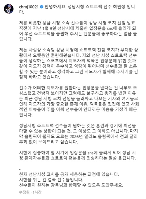 최민정은 31일 자신의 SNS에 올린 '코치 채용에 대한 선수 입장' 게시글 수정을 통해 "성남시청 코치 선임 발표 직전 지난 1월 9일 성남시에 제출한 입장문을 SNS에 올리게 돼 우선 쇼트트랙을 응원해 주시는 팬분들께 송구하다는 말씀을 올린다"며 "저와 성남시청 쇼트트랙 선수들이 생각하는 스포츠에서 지도자의 덕목은 입장문에 밝힌 것과 같이 지도자 경력이 우수하고 역량이 뛰어나며 선수들과 잘 소통할 수 있는 분이라고 생각하고, 그런 지도자가 함께해 주시기를 간절히 바라고 있다"고 적었다.