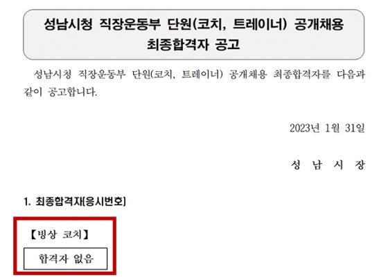 성남시청은 31일 '직장운동부 단원(코치, 트레이너) 공개채용 최종합격자 공고'를 통해 빙상 코치 합격자는 없다고 발표했다. 시 관계자는 이날 스타뉴스와 통화에서 "향후 일정에 대해서는 아직 정해진 바가 없다"면서 "앞으로 계획에 대해 앞으로 정해나가야 한다"고 밝혔다. 이로써 최민정을 비롯한 성남시청 소속 선수단은 앞으로도 당분간 코치 없이 대회를 준비할 수밖에 없는 처지가 됐다.