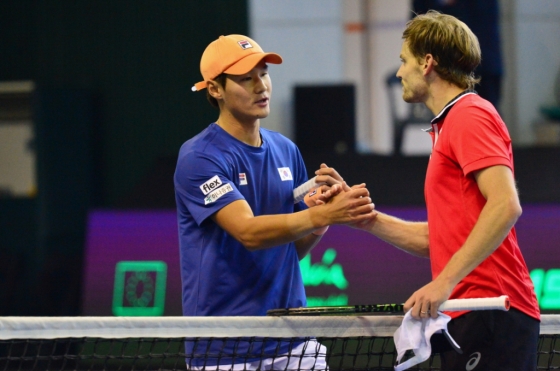 그러나 둘째 날은 달랐다. 이날 한국은 앞서 복식에서 송민규(복식 147위·KDB산업은행)-남지성(복식 152위·세종시청)조가 요란 블리겐(53위)-산더 질레(55위)조를 세트 스코어 2-0(7-6 7-6)으로 제압하며 반전의 기회를 잡았다.