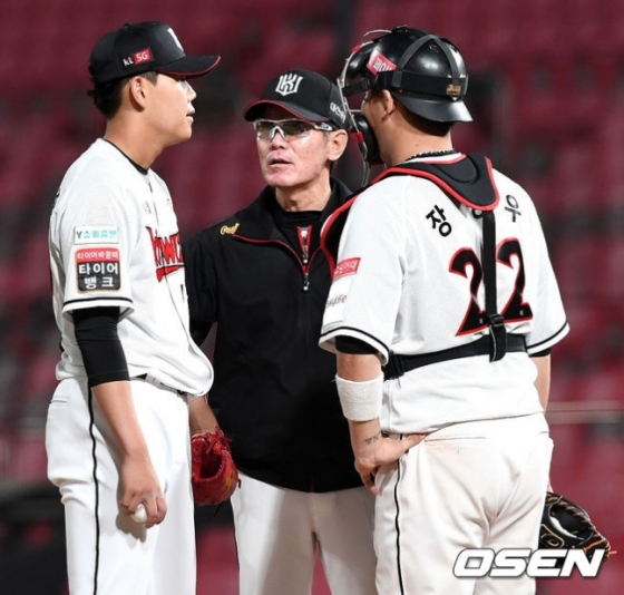 2022 KBO리그 경기 도중 마운드에 올라 투수 소형준(왼쪽)을 격려하고 있는 이강철(가운데) KT 위즈 감독. /사진=OSEN