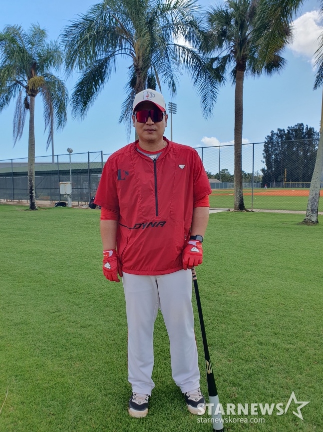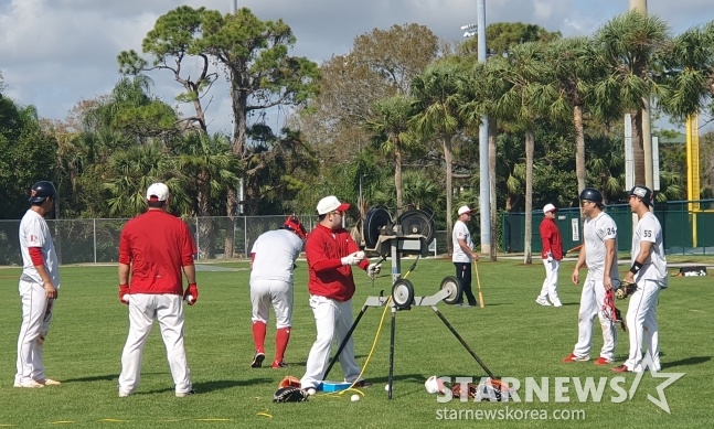 훈련 자체는 다른 구단 스프링캠프에서도 종종 볼 수 있는 포수 팝 플라이 적응 훈련이었다. 피칭 머신을 하늘로 조준해 공을 높게 쏘아 올리고, 떨어지는 그 공을 포수들이 캐치한다. 이때 포수 마스크도 착용해 현실감을 더 높였다.