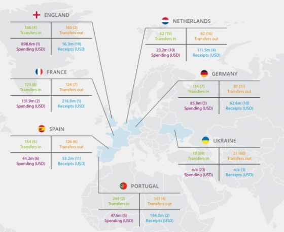 잉글랜드에 이어 두 번째로 이적료를 많이 쓴 국가는 프랑스로 1억 3190만 달러(약 1676억원)이었는데, 잉글랜드와는 격차가 컸다. 그 뒤를 독일(8580만 달러·약 1091억원)과 포르투갈(4760만 달러·약 605억원), 스페인 (4420만 달러·약 562억원), 네덜란드(2320만 달러·약 295억원)가 이었다.