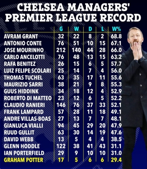 영국 매체 '더 선'은 20일(한국시간) "포터는 잉글리시 프리미어리그(EPL)에서 첼시 감독 중 최악의 기록을 갖고 있다. 그의 승률은 30%도 채 되지 않는다"라고 전했다.