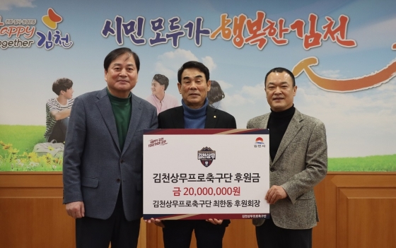 김천상무프로축구단이 21일 오전, 김천시청 2층 접견실에서 최한동 후원회장, 여영각 혁신푸드 대표의 후원금 전달식을 진행했다. 최한동 후원회장은 2,000만원을, 여영각 혁신푸드 대표는 1,000만원을 전달했다. 이날 행사에는 김천상무 배낙호 대표이사, 이재하 단장이 참석했다.
