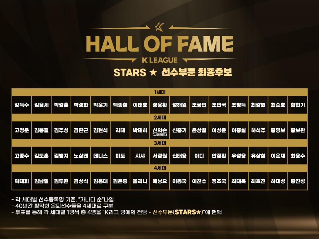 ‘K리그 명예의 전당’은 ‘선수(STARS)’, ‘지도자(LEADERS)’, ‘공헌자(HONORS)’ 3개 부문으로 구성되며, 2023년을 시작으로 향후 2년마다 헌액자를 선정할 예정이다. 시행 첫해인 올해 선수 부문은 프로축구 출범 40주년의 의미를 담아 역대 최고의 선수들을 각 10년의 세대별로 1명씩, 총 4명 선정해 헌액할 예정이다.
