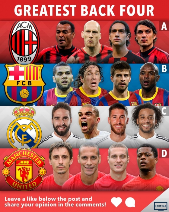 축구 콘텐츠 제작소 ‘foot.var’은 6일 “축구에서 가장 위대한 백포 라인, 당신의 선택은?”이라는 주제와 함께 맨체스터 유나이티드, 레알 마드리드. 바르셀로나, AC밀란을 언급했다.
