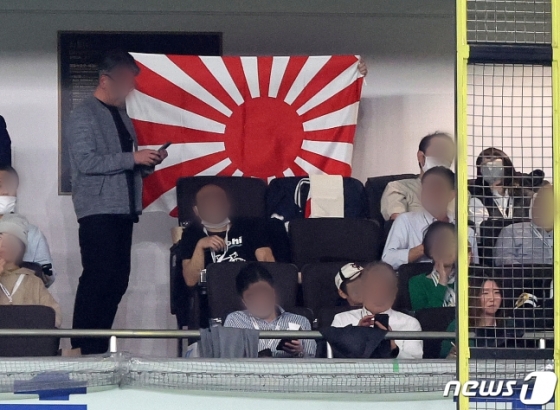 이날 경기가 열린 도쿄돔의 총 4만6000석이 가득찬 가운데, 일본 군국주의의 상징인 욱일기가 등장하며 논란이 커지고 있다.