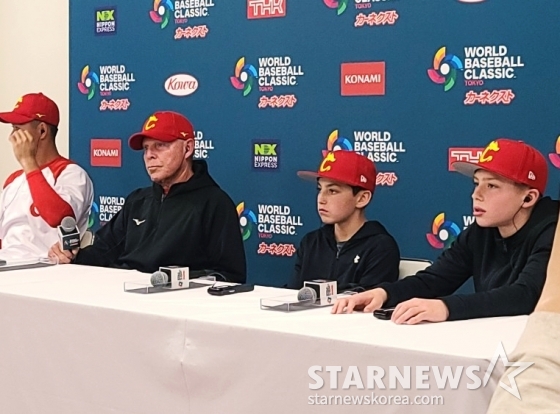 [도쿄(일본)=김우종 스타뉴스 기자] 유쾌한 중국 대표팀 감독이었다. 한국과 최종전에 임하는 딘 트리너 중국 야구 대표팀 감독이 두 손자와 함께 공식기자회견에 참석했다.