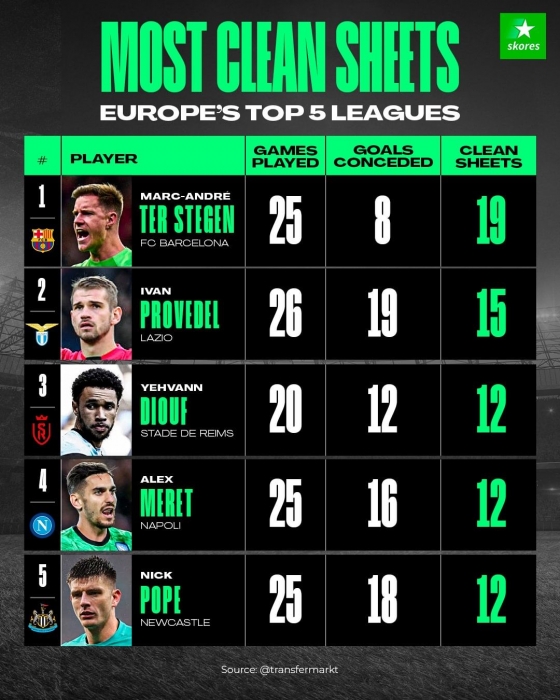 테어 슈테겐은 유럽 5대 리그 최다 클린 시트 골키퍼에 이름을 올렸다. 이반 프로베델(나폴리), 에흐반 디우프(스타드 랭스), 알렉스 메레(나폴리), 닉 포프(뉴캐슬 유나이티드)가 뒤를 이었다.