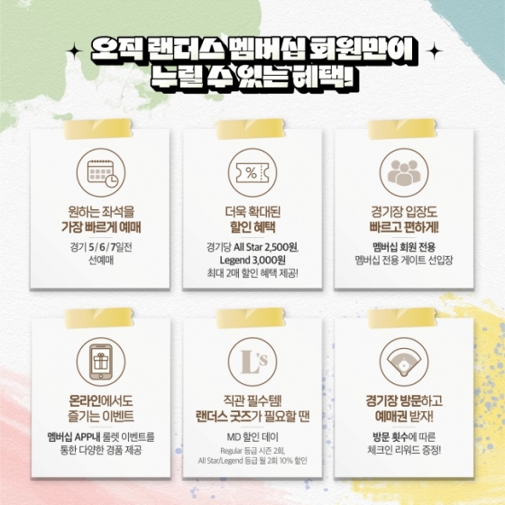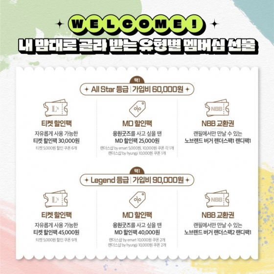 특히 All Star와 Legend 회원에게는 가입선물로 티켓 할인팩, MD 할인팩, 노브랜드 버거 교환권 중 1개를 개인 취향에 맞게 선택해(등급에 따라 금액 차등 제공) 회원들이 자신의 경기장 내 소비 패턴에 따라 원하는 가입 선물을 받을 수 있도록 제공된다. 또한 올해부터는 티켓 예매 시 All Star 회원은 2,500원, Legend 회원은 3,000원을 할인(경기당 최대 2매) 받을 수 있다.