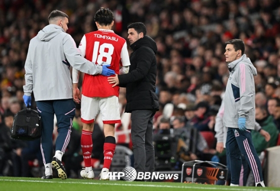 도미야스는 지난 17일 스포르팅CP와 2022~2023 유럽축구연맹(UEFA) 유로파리그(UEL) 16강 2차전 전반 9분 만에 방향 전환 과정에서 무릎을 다쳤다. 극심한 통증을 나타냈고 좌절감을 나타내며 피치를 빠져나갔다.