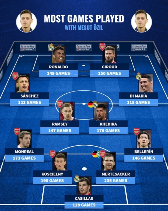 그와 함께 했던 동료들조차 최고 수준이었다. 유럽 축구 통계 매체 ‘트랜스퍼마크트’는 외질과 함께 했던 동료들을 중심으로 베스트 11을 짰다.
