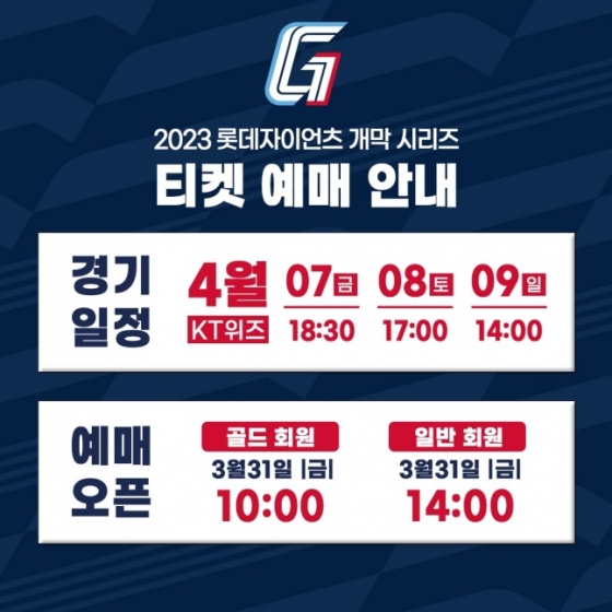 롯데는 "4월 7일부터 9일까지 열리는 KT 위즈와 2023시즌 홈 개막 시리즈 입장권 예매를 오는 31일 오후 2시부터 시작한다"고 28일 밝혔다.