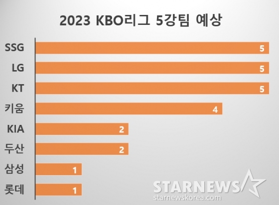 [안호근 스타뉴스 기자] 2023 KBO리그가 4월 1일 오후 2시 전국 5개 구장에서 개막한다. 스타뉴스 설문 결과, 해설위원들은 올 시즌 가을야구를 펼칠 5강 팀으로는 SSG와 LG·KT 등 '3강'과 키움, 그리고 남은 한 자리를 두고는 KIA와 두산이 경합할 것으로 내다봤다.