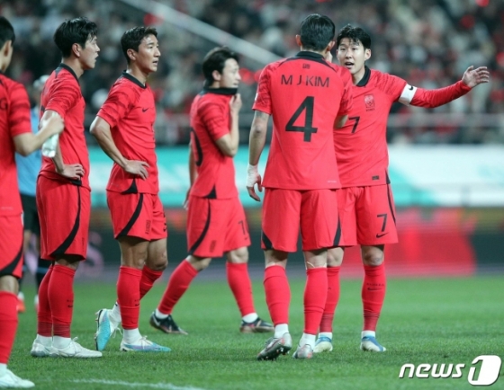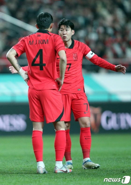 손흥민(오른쪽)과 김민재가 28일 서울월드컵경기장에서 열린 우루과이와 평가전 도중 대화를 나누고 있다. /사진=뉴스1