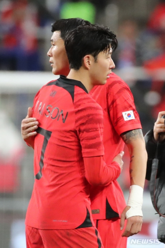지난 24일 콜롬비아와 평가전을 마친 뒤 포옹을 하고 있는 손흥민(왼쪽)과 김민재. /사진=뉴시스