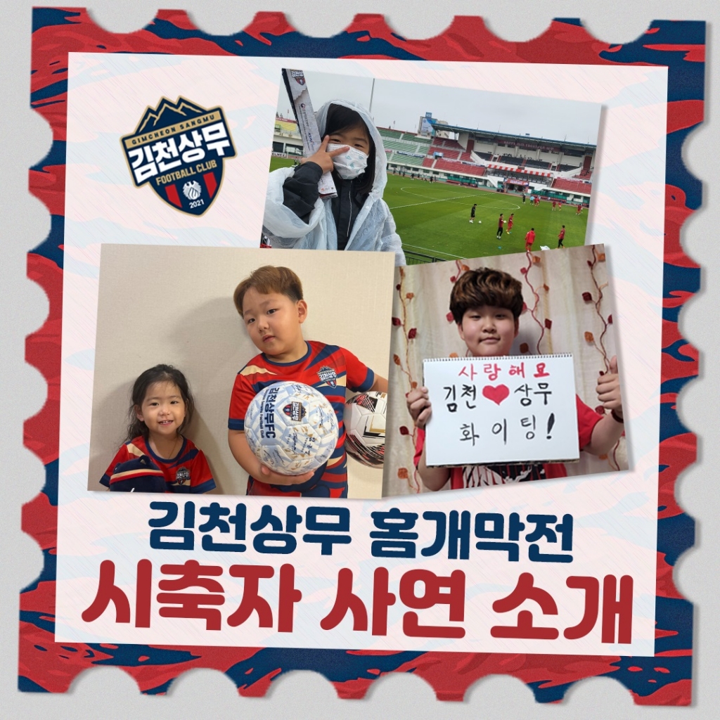 시축 어린이로는 김천시에 거주하는 이정민(8) 군, 전석현(11) 군, 정주언(9) 양과 구미시에 거주하는 안소미(9) 양이 선정됐다. 이정민 군은 “김천상무 경기를 보며 축구선수의 꿈을 갖게 됐다. 홈 개막전에서 시축자로 꿈에 더 가까워 질 수 있는 기회가 되었으면 한다”고 사연을 보냈다.