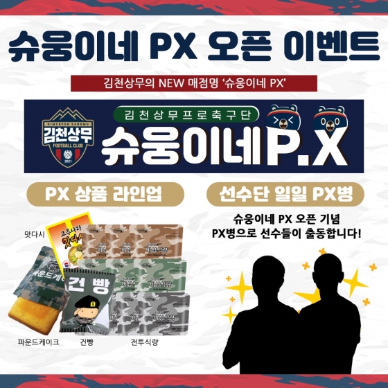 2023 시즌 홈 개막을 앞두고 김천은 가변석 출입구, 선수단 라커룸 등 팬 맞이 리모델링을 진행했다. 이번에는 매점이다. 기존의 ‘매점’에서 간판 및 디자인 등 리모델링을 통해 김천상무 군 팀 특성을 살린 ‘슈웅이네 PX’가 탄생했다.