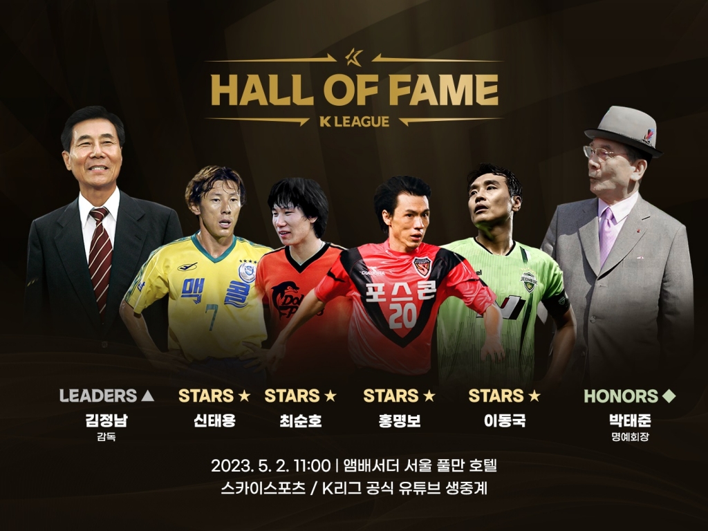 'K리그 명예의전당'은 한국프로축구연맹(총재 권오갑)이 K리그 출범 40주년을 기념해 올해 신설했다. 'K리그 명예의전당'은 선수, 지도자, 공헌자 3개 부문으로 구성되고, 올해를 시작으로 향후 매 2년마다 헌액자를 선정한다. 초대 헌액자로는 선수 부문에 최순호, 홍명보, 신태용, 이동국, 지도자 부문에 김정남 전 울산현대 감독, 공헌자 부문에 故 박태준 포스코 명예회장이 이름을 올렸다.