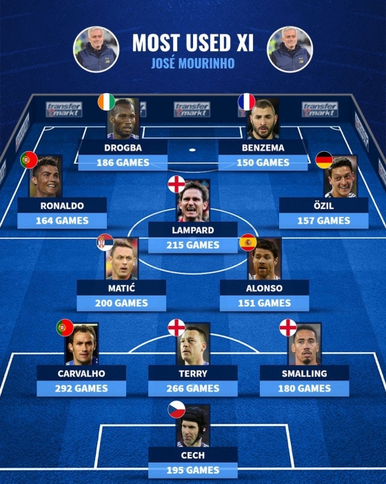 축구 통계 사이트 ‘트랜스퍼마켓’은 25일 ‘스폐셜 원 FC’라며 조세 무리뉴 감독이 가장 많이 활용한 선수 베스트 11을 공개했다.