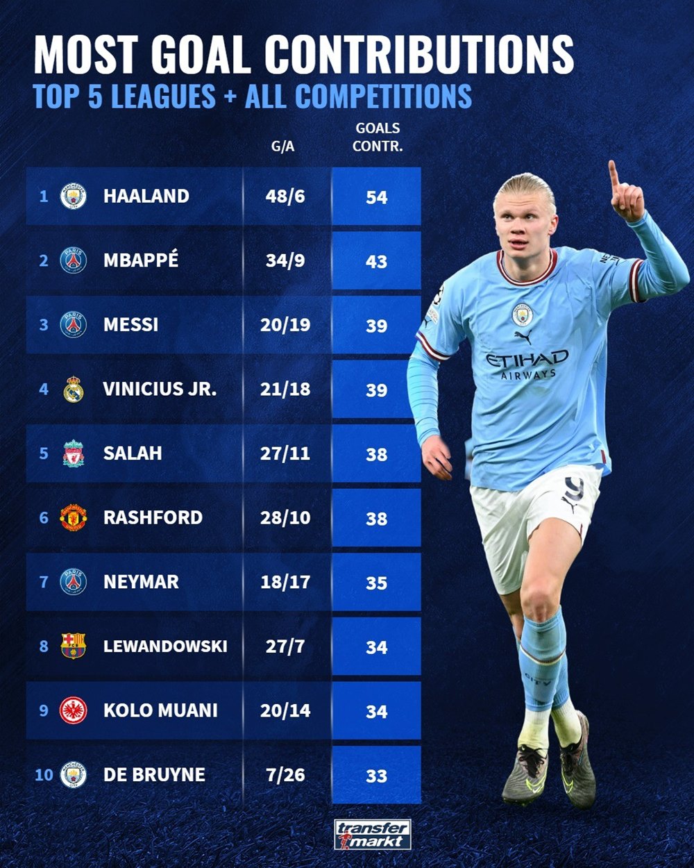 유럽 축구 통계 매체 ‘트랜스퍼마크트’는 26일(한국시간) 2022/2023 유럽 5대리그(잉글랜드, 프랑스, 독일, 이탈리아, 스페인) 소속 선수들의 최다 공격포인트 TOP10을 나열했다. 리그와 컵 대회를 포함한 기록이다.