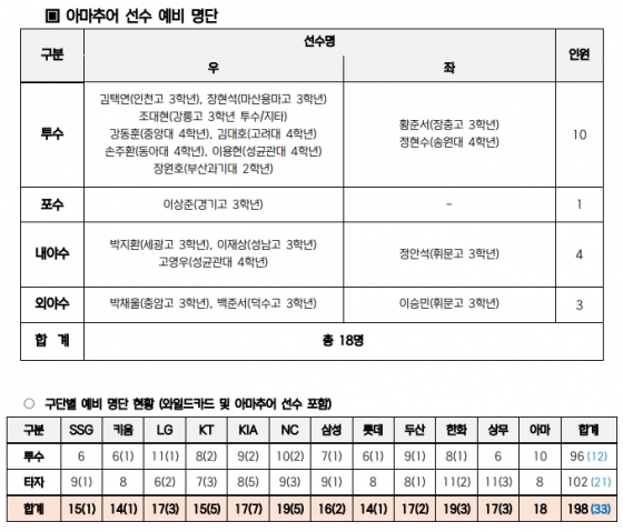 대표팀 예비 명단으로는 만 25세 이하 또는 입단 4년 차 이하 선수 147명(신인 17명)과 와일드카드 33명 등 프로 180명(투수 86명, 포수 19명, 내야수 47명, 외야수 28명)과 아마추어 선수 18명(투수 10명)까지 총 198명의 선수가 선발되어 대한야구소프트볼협회를 통해 대한체육회에 제출됐다.