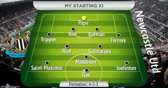 이 매체에 따르면 뉴캐슬은 4-3-3 포메이션이다. 전방에 조엘링턴, 이삭, 생 막시맹, 중원에는 기마랑이스, 메디슨, 라이스가 이름을 올렸다. 포백은 티어니, 보트만, 김민재, 트리피어, 골문은 닉 포프다.