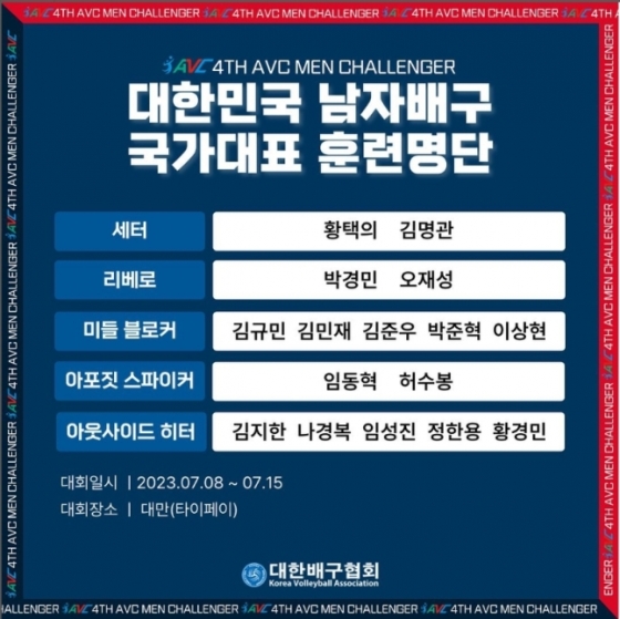 대한배구협회는 오는 7월 8일부터 15일까지 타이완 타이베이에서 열리는 2023 아시아배구연맹(AVC) 챌린저 남자배구대회에 출전할 대표팀 명단을 발표했다.