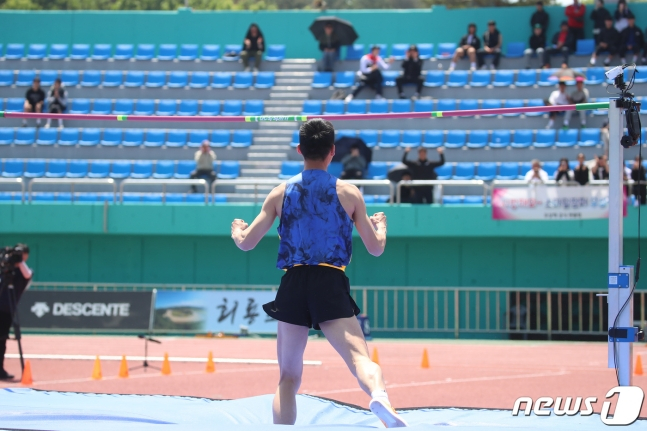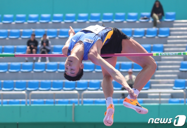 우상혁은 9일 경상북도 예천 스타디움에서 열린 KBS배 전국육상경기대회 남자 대학·일반부 높이뛰기에 출전해 우승을 차지했다. 첫 점프에서 2m16을 뛰어넘으며 금메달을 손에 넣은 우상혁은 두 번째엔 2m32를 훌쩍 넘어섰다.