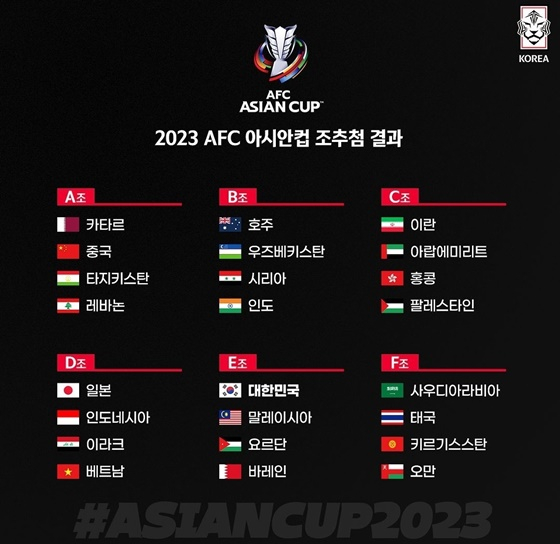 아시아축구연맹(AFC)은 11일(한국시간) 카타르 도하의 오페라 하우스에서 카타르 아시안컵 조추첨을 진행했다. 조추첨 결과 한국은 요르단과 바레인, 말레이시아와 E조에 편성됐다. 이번 대회는 총 24개국이 출전해 4팀씩 6개조로 나뉘어 조별리그를 치른다. 각 조 1,2위를 비롯해 조 3위 중 성적이 가장 좋은 4팀이 16강에 진출하는 방식이다. 한국은 까다로운 상대를 피해 토너먼트 진출 확률을 높였다.