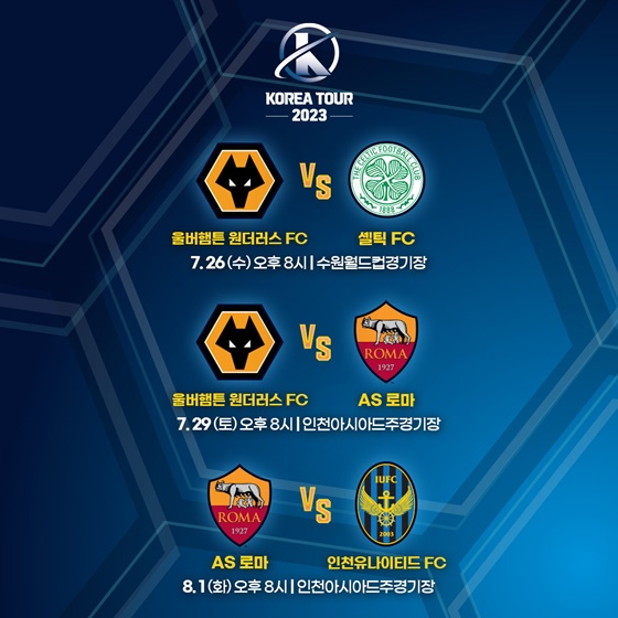 유럽 명문구단들이 7월 한국을 방문한다. 황희찬의 울버햄튼(잉글랜드), 오현규의 셀틱(스코틀랜드), 조세 무리뉴 감독이 이끄는 AS로마(이탈리아)가 주인공이다. K리그1 인천유나이티드도 함께 한다.