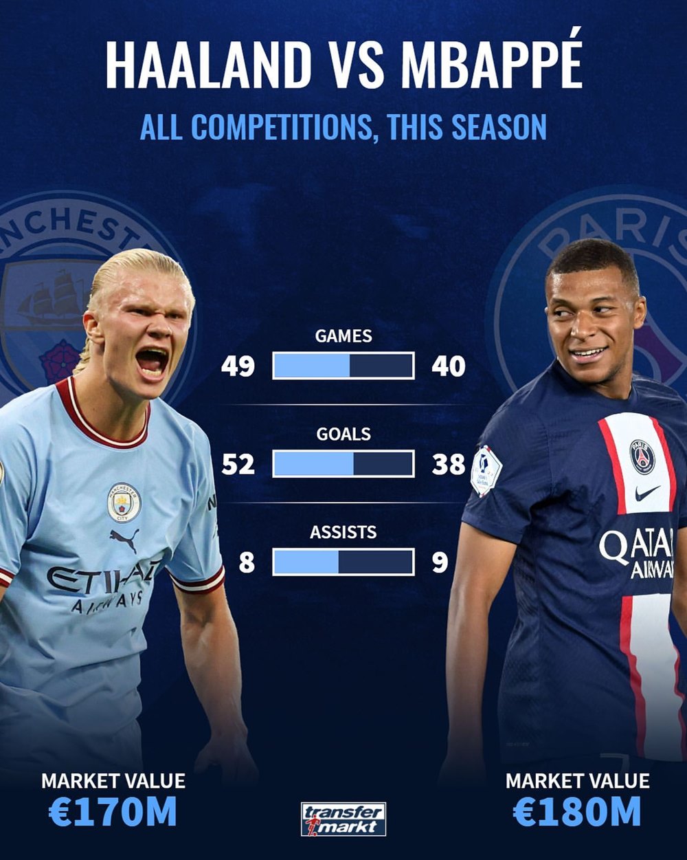 유럽 축구 통계 매체 ‘트랜스퍼마크트’는 지난 21일(현지시간) 홀란과 음바페의 올 시즌 현재까지 스탯을 비교했다. 기준은 리그와 컵 대회 포함이다.