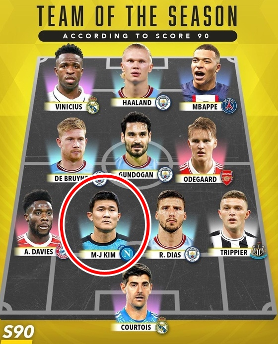 대활약을 펼친 김민재는 2022~2023시즌 세리에A 올해의 팀 45인 후보에 포함되는 영광을 안았다. 총 13명의 수비수 중 김민재도 당당히 이름을 올렸다. 크리스 스몰링(AS로마), 글레이송 브레머(유벤투스), 조르지오 스칼비니(아탈란타), 알레시오 로마놀리(라치오) 등 리그 정상급 수비수들과 어깨를 나란히 했다. 여기에 글로벌 축구 커뮤니티 스코어90이 선정하는 월드 베스트11에도 뽑혔다. 면면을 살펴보면 그야말로 월드클래스 급이다. 골키퍼 티보 쿠르투아(레알 마드리드)와 함께 포백 라인에 알폰소 데이비스(바이에른 뮌헨), 후벵 디아스(맨체스터 시티), 키에런 트리피어(뉴캐슬), 그리고 김민재가 자리했다. 케빈 데 브라이너와 일카이 귄도안(이상 맨체스터 시티), 마르틴 외데가르드(아스날)이 미드필더, 비니시우스 주니오르(레알), 엘링 홀란드(맨시티), 킬리안 음바페(파리 생제르맹)가 공격수 포지션을 각각 차지했다.