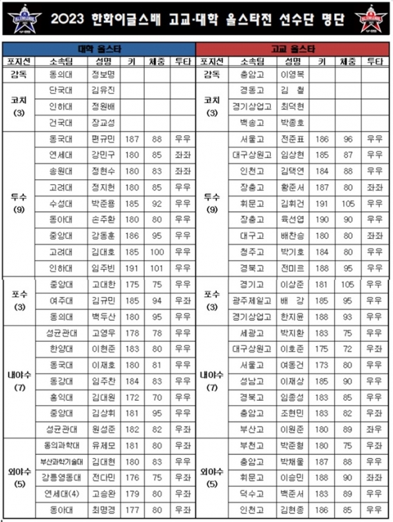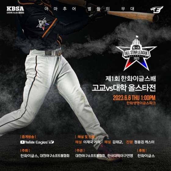 대한야구소프트볼협회(KBSA·회장 이종훈)와 한화 이글스는 오는 6월 6일 한화생명이글스 파크에서 개최되는 2023 제1회 한화 이글스배 고교·대학 올스타전 경기에 참가할 고교, 대학 선수단을 최종 선발했다고 25일 밝혔다.