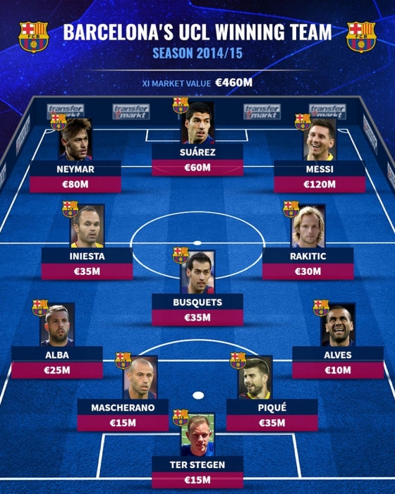 유럽 축구 통계 매체 ‘트랜스퍼마크트’는 25일(한국시간) 2014/2015시즌 바르사의 트레블 멤버를 조명했다.