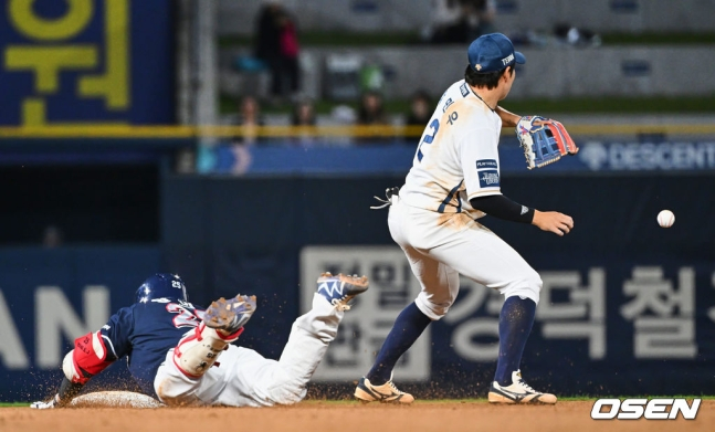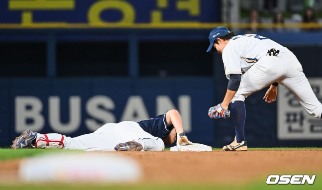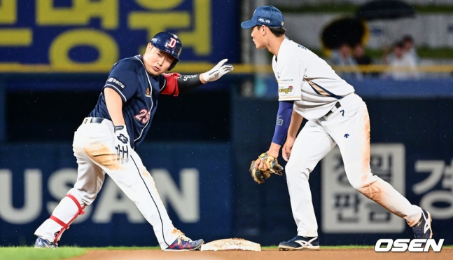 그러나 양의지는 지체 없이 2루 베이스로 향했다. 혼신의 질주를 선보인 양의지는 2루에 헤드퍼스트 슬라이딩으로 들어갔다. 앞서 4년 동안 한솥밥을 먹었던 NC 2루수 박민우조차 놀랍다는 표정을 지을 정도였다. 양의지가 헤드퍼스트 슬라이딩을 시도하는 건 자주 보기 어려운 일이기 때문이다.