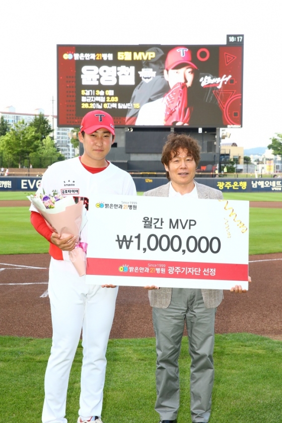 윤영철은 지난 5월 한 달 간 5경기에 선발 등판해 26⅔이닝 동안 탈삼진 15개를 잡아내며 평균자책점 2.03을 기록, 3승을 거뒀다. 이날 시상은 밝은안과21병원 주종대 원장이 했고, 시상금은 100만원이다.
