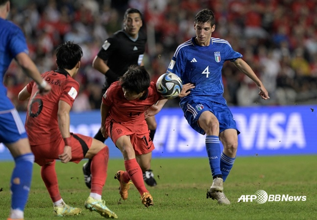 경기 초반 흐름은 이탈리아가 가져갔다. 전반 8분 암브로시노가 왼쪽 측면에서 올라온 크로스를 헤더로 연결했지만 골대 오른편으로 벗어났다. 이어 1분 뒤 발단치가 페널티박스 가운데서 오른발 슛을 때렸지만 김준홍 골키퍼가 몸을 날려 잡아냈다. 한국은 수비에 치중하며 간간이 역습을 시도했지만 이탈리아의 빗장수비에 막혀 제대로 된 공격 기회를 얻지 못했다.